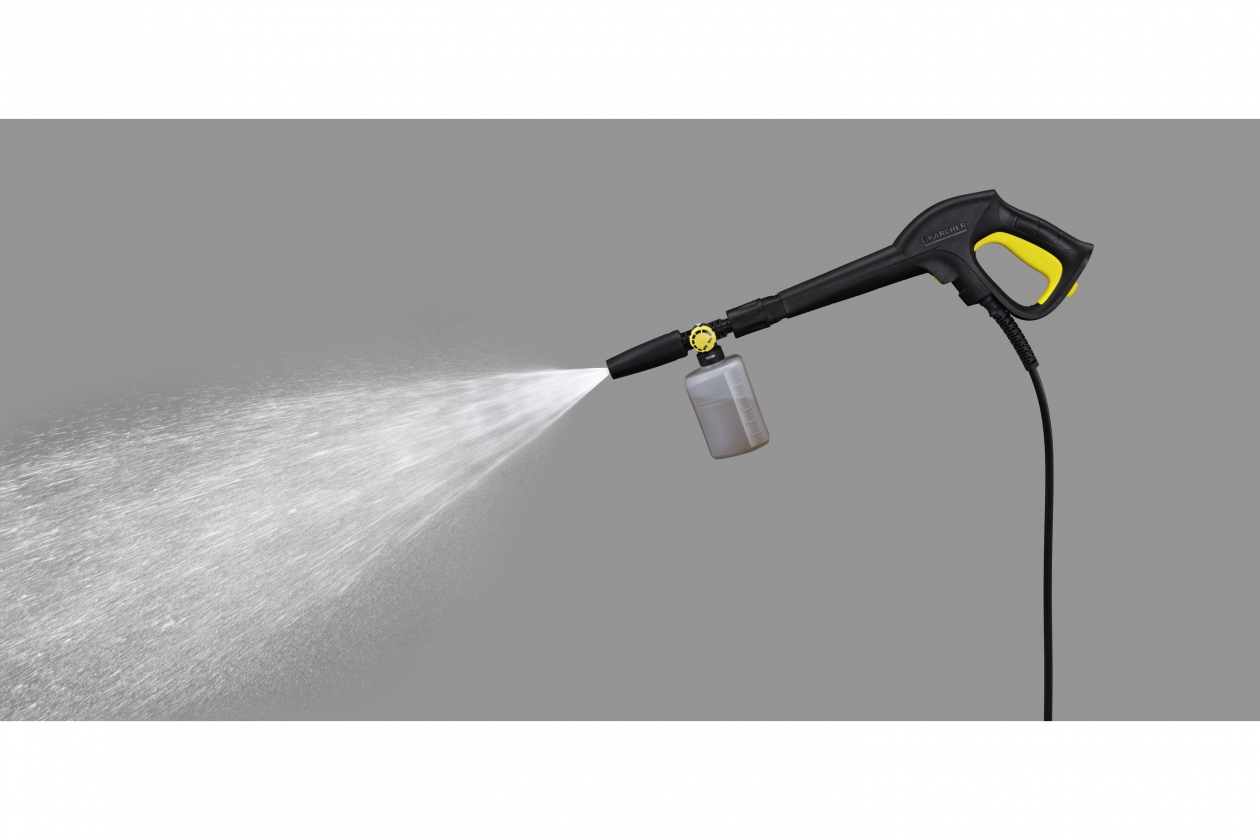 FJ 6 mlaznica za pjenu s posebno snažnom pjenom za jednostavno čišćenje svih površina kao što je lak, staklo ili kamen. Idealna za vozila, zimske vrtove, vrtni namještaj, fasade, stepenice, kampere, staze, zidove, žaluzine, terase, kolne ulaze itd. Volumen spremnika iznosi oko 0,6 l. Kärcher sredstvo za čišćenje uliti izravno u mlaznicu za pjenu, mlaznicu priključiti na pištolj i nanijeti pjenu. Doziranje sredstva za čišćenje moguće je komforno regulirati na mlaznici za pjenu (žuti gumb). Razina mlaza može se okretati po potrebi. Prikladna za sve Kärcher Consumer viskotlačne čistače klase K2 - K7. Idealna u kombinaciji s Kärcher Ultra Foam Cleaner-om.